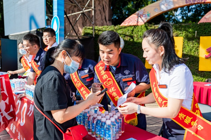 上午8時(shí),設置在竹湖園廣場(chǎng)的“520”便民服務(wù)點(diǎn),熱鬧不已,炳草崗水廠(chǎng)、怡康飲用水有限公司共產(chǎn)黨員服務(wù)隊、青年志愿者服務(wù)隊的隊員們,禮貌熱情地向群眾介紹集團公司“520”服務(wù)品牌建設理念,發(fā)放“520”民生服務(wù)承諾、現行水價(jià)政策、用水節水常識等宣傳資料,對群眾關(guān)心的水質(zhì)、水壓、抄表、收費等問(wèn)題進(jìn)行耐心細致的逐一解答。